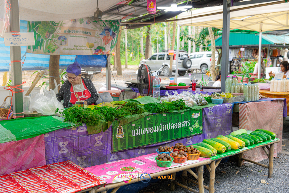 ส่วนบริเวณด้านหน้าวัดจะมีตลาดนัดซุ้มต้นไผ่ เป็นตลาดนัดชุมชนจำหน่ายสินค้าพื้นบ้านมีสินค้าผลผลิตจากคนในท้องถิ่น ไม่ว่าจะเป็นผักผลไม้ที่ปลูกแบบออร์แกนิก ผักปลอดสารพิษ จำหน่ายในราคาย่อมเยาว์ รวมถึงมีอาหารท้องถิ่น ขนมต่างๆ เหมาะกับการซื้อเป็นของฝากกลับบ้าน โดยเฉพาะในวันเสาร์ อาทิตย์ และวันหยุดนักขัตฤกษ์จะมีสินค้าจำหน่ายมากเป็นพิเศษ