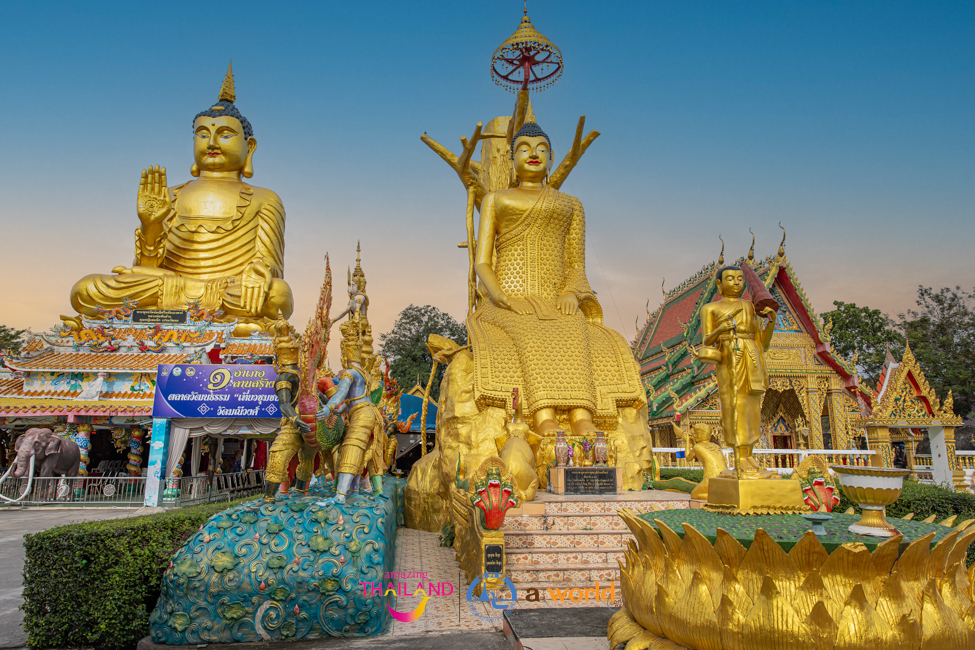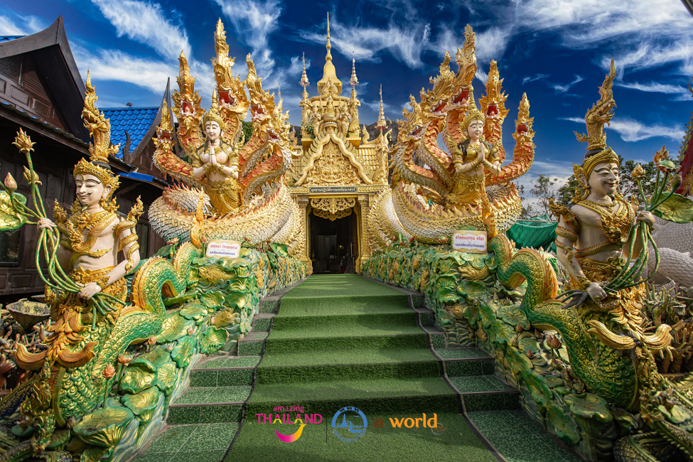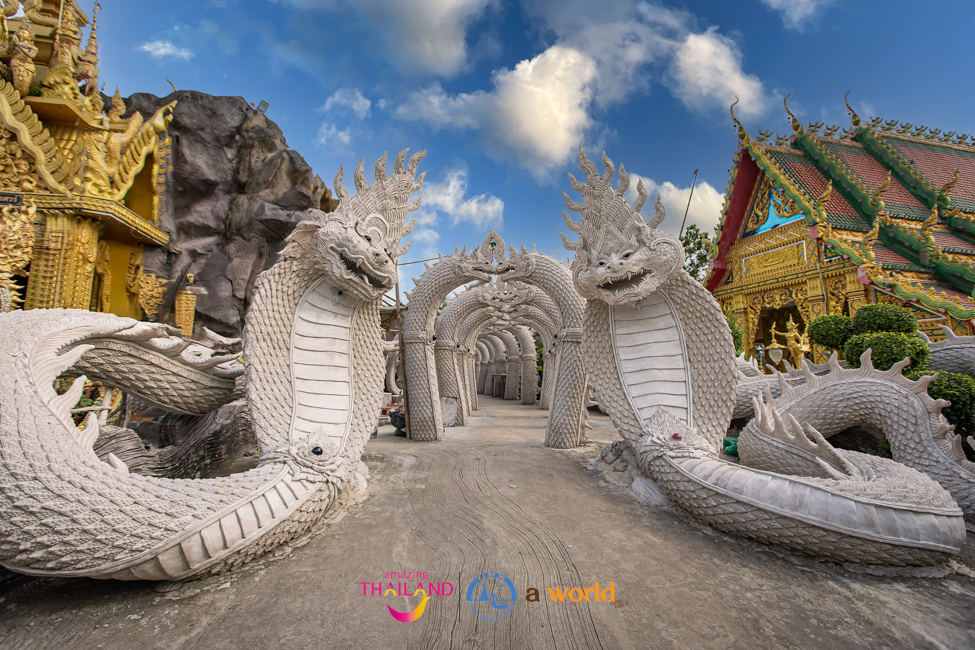ด้วยสถาปัตยกรรมที่โดดเด่นด้วยปูนปั้นที่นอกจากพระพุทธรูปแล้วก็ยังมีปูนปั้นรูปพญานาคมากกว่าสองพันตน และจุดโดดเด่นมีเอกลักษณ์ของที่นี่ก็คือ วังรัตนมณีมหานครบาดาลนาคราช หรือ วังพญานาค เป็นการผสมผสานระหว่างความเชื่อทางพุทธศาสนาและตำนานพญานาคที่ชาวไทยเลื่อมใสศรัทธา นับว่าเป็นการจำลองเมืองบาดาลด้วยงานศิลป์ที่แฝงคติธรรม และเพิ่มแสงสีที่ดูยิ่งใหญ่อลังการที่สุดแห่งหนึ่งในประเทศไทย