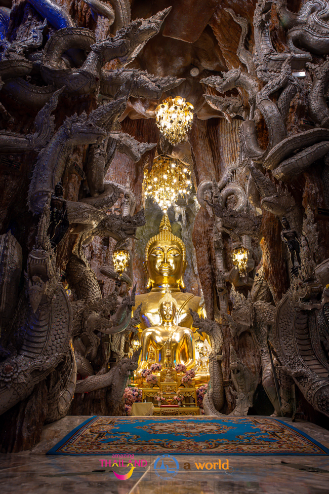 ส่วนโถงชั้นในนอกจากจะมีรูปปูนปั้นของพญานาคแล้วยังเป็นที่ประดิษฐาน พระมหาจักรพรรดิชัยบาดาล หรือพระรัตนมณีมหาบาดาล องค์พระประธานขนาดใหญ่สีทองเหลืองอร่ามอยู่ท่ามกลางพญานาคจำนวนมาก ประดับไฟตกแต่งส่องแสงระยิบระยับทำให้ดูบรรยากาศสมจริงและสวยงาม