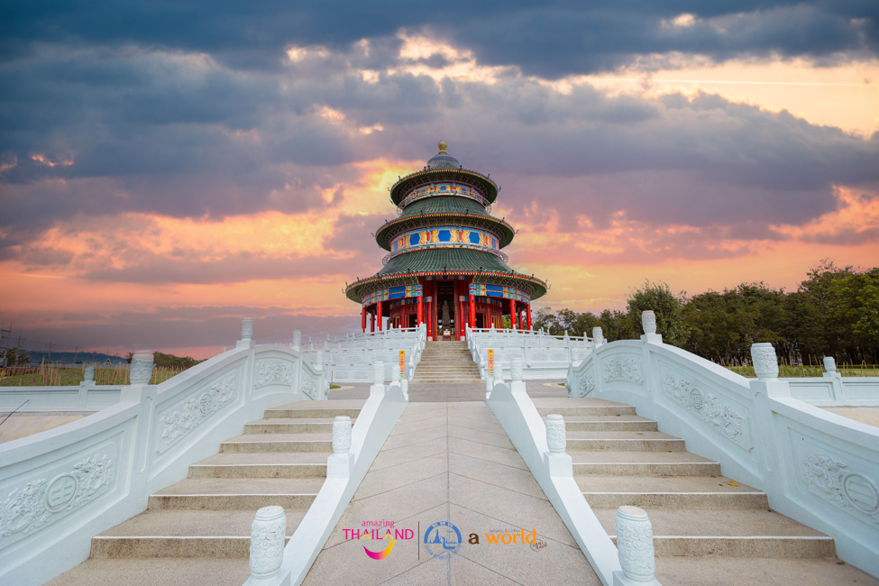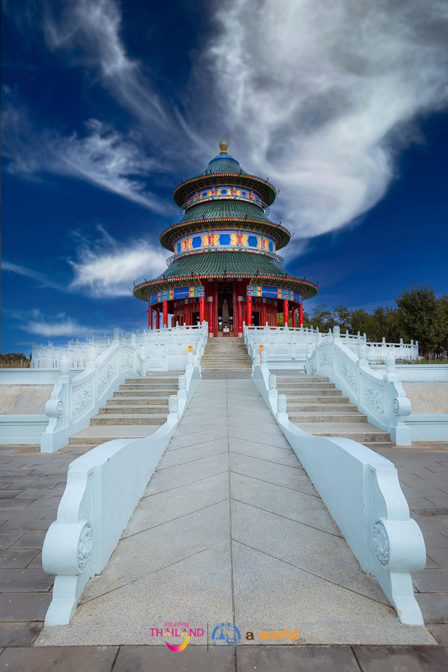 อาคารวิหารเริ่มก่อสร้างใน ปี พ.ศ. 2558 โดยแรงบันดาลใจในการออกแบบมาจากหอสักการะฟ้าเทียนถัน กรุงปักกิ่ง ประเทศจีน นำการวางผังอาคารแบบวงกลมและการซ้อนชั้นหลังคา 3 ชั้น มาเป็นหลักในการวางผังอาคารวิหาร การวางผังแบบวงกลมเป็นผลจากอิทธิพลการวางผังของคติภูมิจักรวาล โดยมีวิหารเป็นดั่งเขาพระสุเมรุ มองจากภายนอกวิหารจะเห็นเสาทั้งหมด 24 ต้น มีชั้นในและนอกชั้นละ 12 ต้น ซึ่งหมายถึงปีนักษัตรทั้ง 12 ส่วนผนังประกอบด้วยภาพเขียนสีจิตรกรรมแบบจีนสัญลักษณ์แห่งความมงคล เช่น ลายเมฆ ลายดอกบัว และ มังกร ด้านบนติดตั้งเสาล่อฟ้าซึ่งมีความหมายลึกซึ้งถึงการดูดซับพลังงานจากท้องฟ้า เป็นเครื่องมือเชื่อมต่อโลกมนุษย์และสวรรค์ เพื่อสื่อสารระหว่างฟ้ากับดิน