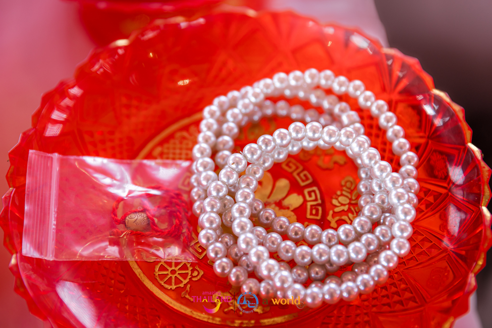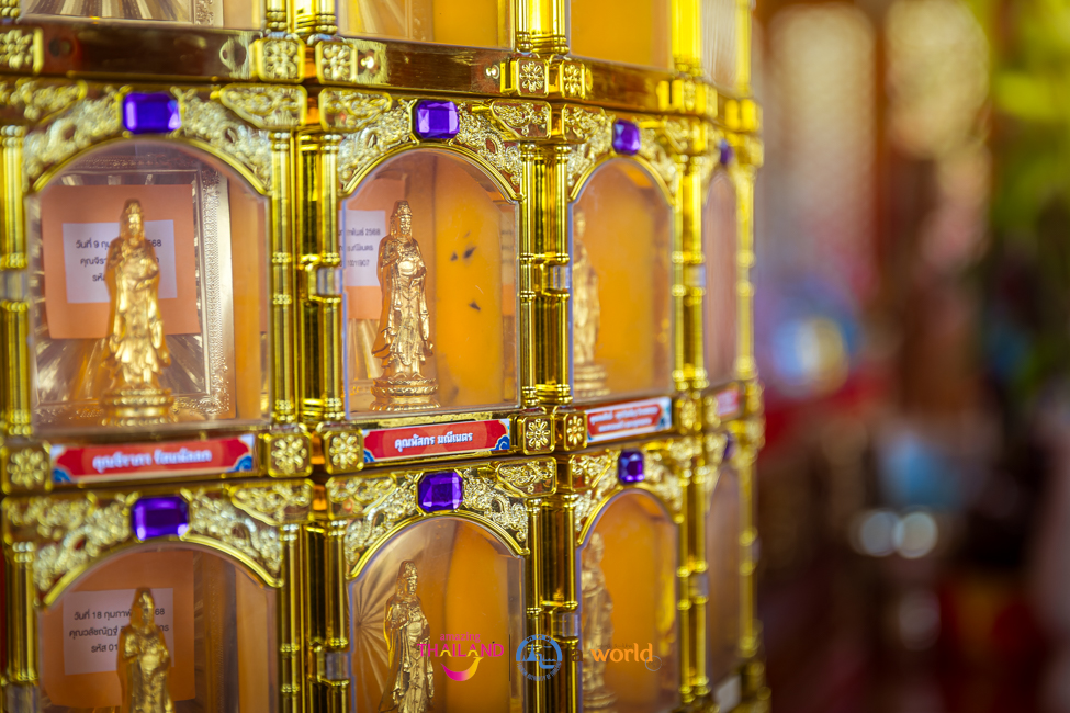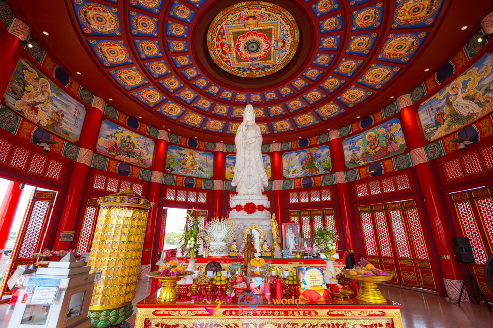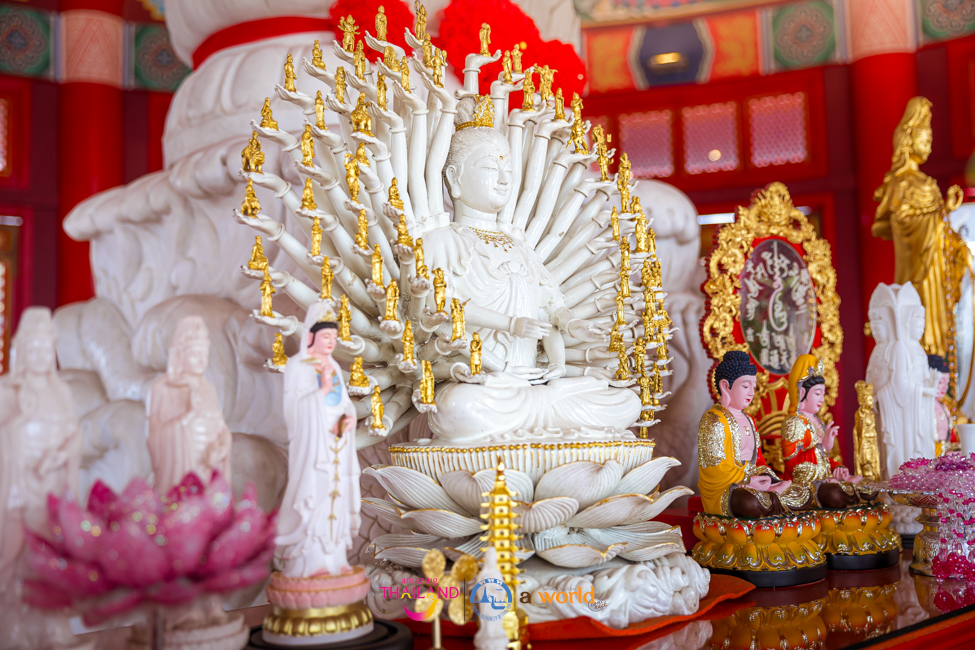 ภายในวิหารประดิษฐานองค์พระโพธิสัตว์กวนอิม อี่ทงเทียนไท้ ที่แกะสลักจากหยกสีขาวนำมาจากเหมืองในป่าลึก ของเมืองนับปีตรู ประเทศพม่า ขนาดขององค์พระโพธิสัตว์กวนอิมมีความสูงถึง 2.62 เมตร หนัก 2.8 ตัน ฐานบัวสูง 0.45 เมตร หนัก 0.78 ตัน มีฐานมังกรและฐานแปดเหลี่ยม แกะสลักโดยช่างชาวจีนในปางประทานพรประทับบนมังกร ในมือของพระองค์ถือแจกันประทานน้ำอมฤต น้ำมนต์ศักดิ์สิทธิ์ และกิ่งหลิว ไว้คอยชะล้างขจัดปัดเป่าทุกข์โศกโรคภัยของผู้ที่มากราบไหว้ขอพร และยังเป็นเสมือนน้ำทิพย์ที่ชโลมกายใจให้สะอาดบริสุทธิ์ ชุ่มฉ่ำด้วยน้ำพระทัยแห่งความเมตตา พระองค์ประทับยืนบนหลังพญามังกรเวียนว่ายกลางมหาสมุทร พญามังกรเปรียบได้กับความมั่งคั่ง ร่ำรวย สายน้ำเปรียบได้กับความลื่นไหล ราบรื่น สำเร็จ สำหรับผู้ที่มากราบไหว้บูชาเมื่อกล่าวคำอธิษฐานแล้วให้ลูบที่พญามังกร เพื่อให้ได้ทั้งความสมปรารถนาและร่ำรวย