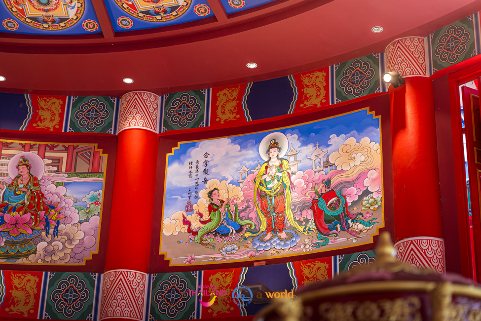 ส่วนภายในโถงวิหารประดับด้วยจิตรกรรมฝาผนังตำนานของพระโพธิสัตว์กวนอิมในแต่ละปาง จำนวน 11 ภาพ จาก 84 ปางที่เป็นที่รู้จัก บนฝ้าเพดานเป็นรูปเขียน มันดาลา สัญลักษณ์แห่งมณฑลศักดิ์สิทธิ์แห่งการตรัสรู้ขององค์พระพุทธเจ้าตามคติธรรมพุทธวัชรยาน