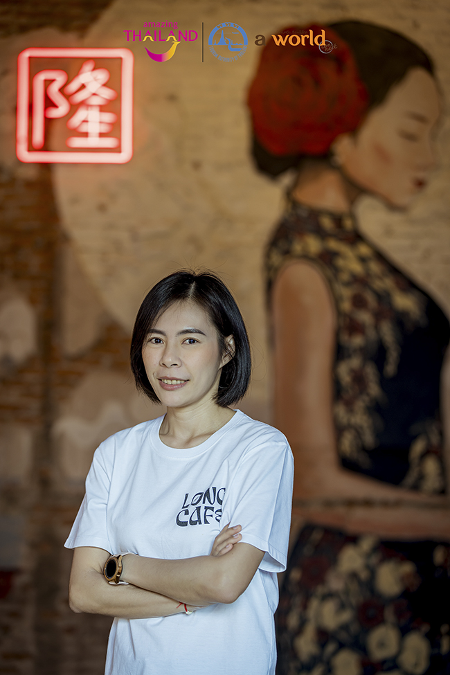 ไฮไลท์อยู่ที่รูปวาดสาวน้อยใส่ชุดกี่เพ้าเป็นมุมเช็คอินยอดนิยม จากไอเดียสุดเก๋ของ คุณอรุณรัตน์ รัตนพันธุ์ ที่นำศาลเจ้าเก่าแก่อายุกว่า 40 ปี มา Renovate ใหม่โดยใช้โครงสร้างเดิมของอาคารรูปแบบของศาลเจ้าเพื่อการอนุรักษ์ให้คงกลิ่นอายความสวยงามของวันวานให้มากที่สุด คุมความเป็น Mood & tone ด้วยการนำเทคนิคการกระเทาะฝาผนังเพ้นท์ให้มีสีสัน เพื่อให้เกิดลวดลายเพิ่มความน่าสนใจของมุมต่างๆ ในคาเฟ่ให้มากขึ้น