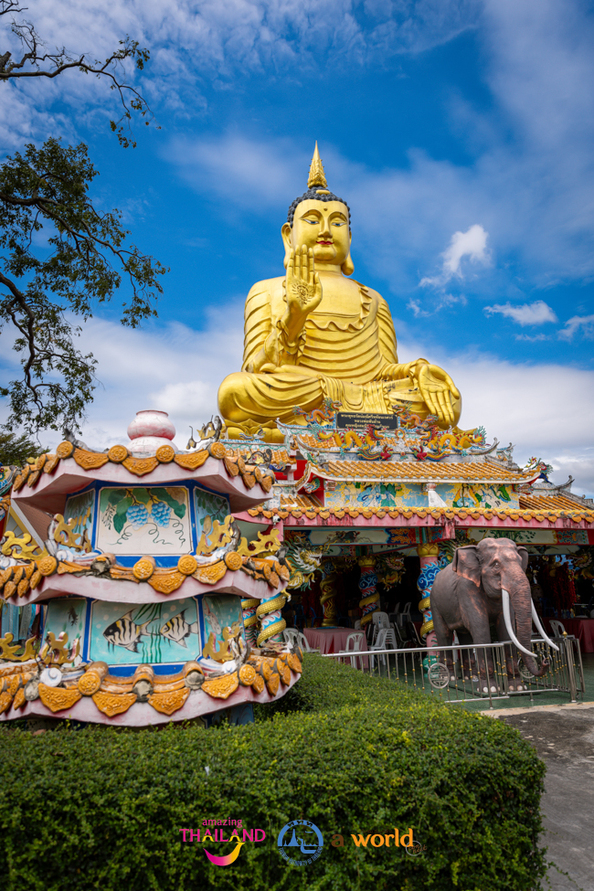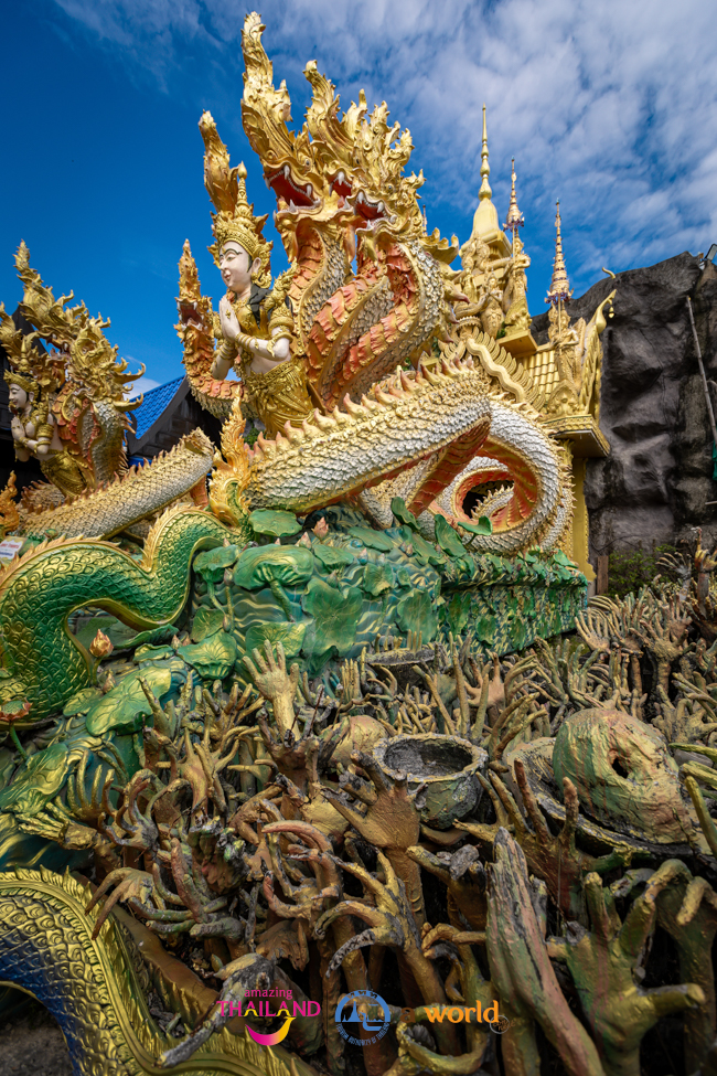 ด้วยสถาปัตยกรรมที่โดดเด่นด้วยปูนปั้นที่นอกจากพระพุทธรูปแล้วก็ยังมีปูนปั้นรูปพญานาคมากกว่าสองพันตน และจุดโดดเด่นมีเอกลักษณ์ของที่นี่ก็คือ วังรัตนมณีมหานครบาดาลนาคราช หรือ วังพญานาค เป็นการผสมผสานระหว่างความเชื่อทางพุทธศาสนาและตำนานพญานาคที่ชาวไทยเลื่อมใสศรัทธา นับว่าเป็นการจำลองเมืองบาดาลด้วยงานศิลป์ที่แฝงคติธรรม และเพิ่มแสงสีที่ดูยิ่งใหญ่อลังการที่สุดแห่งหนึ่งในประเทศไทย