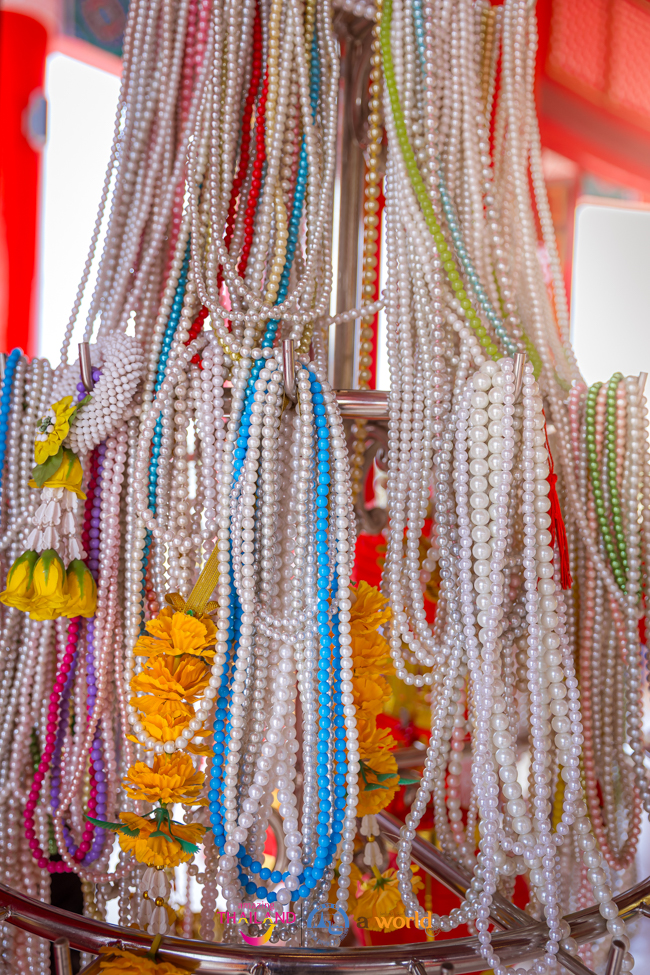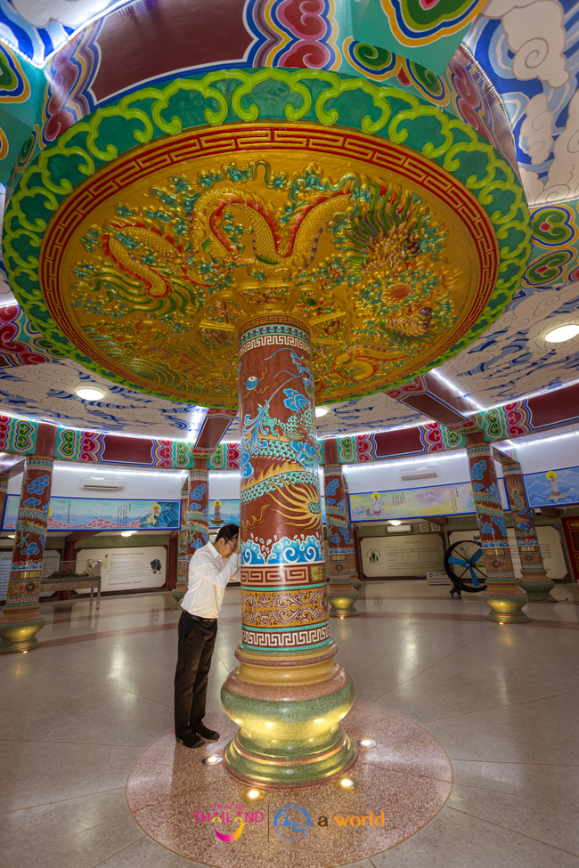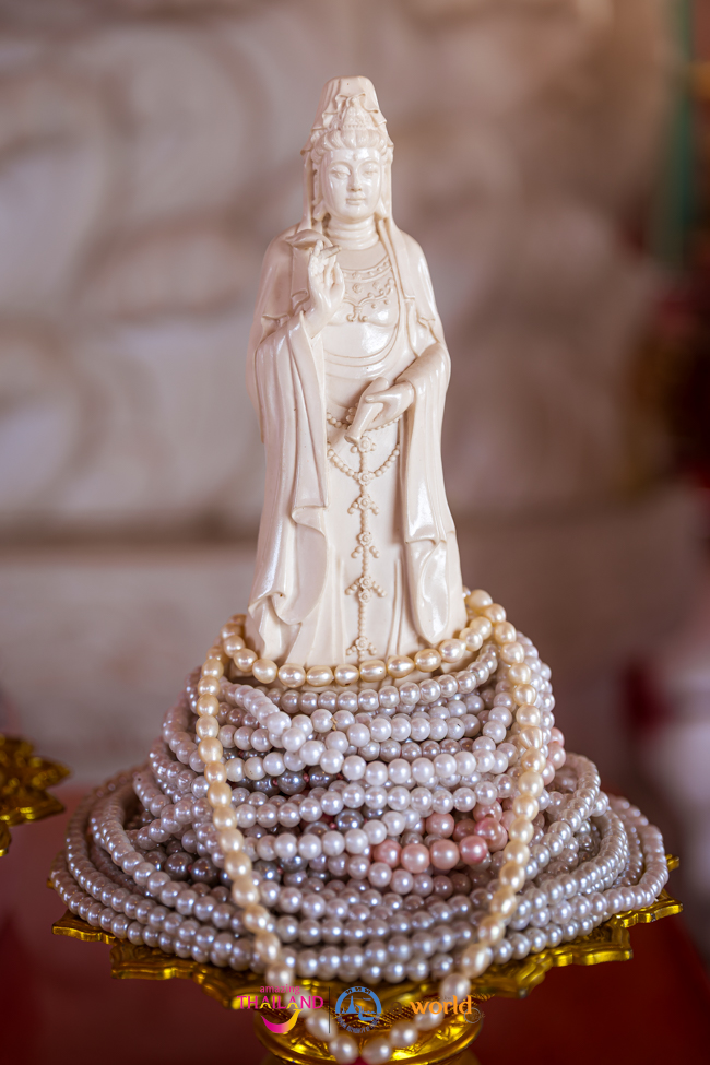 ภายในวิหารประดิษฐานองค์พระโพธิสัตว์กวนอิม อี่ทงเทียนไท้ ที่แกะสลักจากหยกสีขาวนำมาจากเหมืองในป่าลึก ของเมืองนับปีตรู ประเทศพม่า ขนาดขององค์พระโพธิสัตว์กวนอิมมีความสูงถึง 2.62 เมตร หนัก 2.8 ตัน ฐานบัวสูง 0.45 เมตร หนัก 0.78 ตัน มีฐานมังกรและฐานแปดเหลี่ยม แกะสลักโดยช่างชาวจีนในปางประทานพรประทับบนมังกร ในมือของพระองค์ถือแจกันประทานน้ำอมฤต น้ำมนต์ศักดิ์สิทธิ์ และกิ่งหลิว ไว้คอยชะล้างขจัดปัดเป่าทุกข์โศกโรคภัยของผู้ที่มากราบไหว้ขอพร และยังเป็นเสมือนน้ำทิพย์ที่ชโลมกายใจให้สะอาดบริสุทธิ์ ชุ่มฉ่ำด้วยน้ำพระทัยแห่งความเมตตา พระองค์ประทับยืนบนหลังพญามังกรเวียนว่ายกลางมหาสมุทร พญามังกรเปรียบได้กับความมั่งคั่ง ร่ำรวย สายน้ำเปรียบได้กับความลื่นไหล ราบรื่น สำเร็จ สำหรับผู้ที่มากราบไหว้บูชาเมื่อกล่าวคำอธิษฐานแล้วให้ลูบที่พญามังกร เพื่อให้ได้ทั้งความสมปรารถนาและร่ำรวย