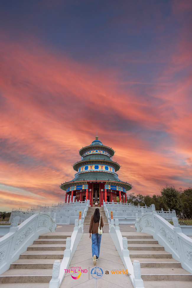 อาคารวิหารเริ่มก่อสร้างใน ปี พ.ศ. 2558 โดยแรงบันดาลใจในการออกแบบมาจากหอสักการะฟ้าเทียนถัน กรุงปักกิ่ง ประเทศจีน นำการวางผังอาคารแบบวงกลมและการซ้อนชั้นหลังคา 3 ชั้น มาเป็นหลักในการวางผังอาคารวิหาร การวางผังแบบวงกลมเป็นผลจากอิทธิพลการวางผังของคติภูมิจักรวาล โดยมีวิหารเป็นดั่งเขาพระสุเมรุ มองจากภายนอกวิหารจะเห็นเสาทั้งหมด 24 ต้น มีชั้นในและนอกชั้นละ 12 ต้น ซึ่งหมายถึงปีนักษัตรทั้ง 12 ส่วนผนังประกอบด้วยภาพเขียนสีจิตรกรรมแบบจีนสัญลักษณ์แห่งความมงคล เช่น ลายเมฆ ลายดอกบัว และ มังกร ด้านบนติดตั้งเสาล่อฟ้าซึ่งมีความหมายลึกซึ้งถึงการดูดซับพลังงานจากท้องฟ้า เป็นเครื่องมือเชื่อมต่อโลกมนุษย์และสวรรค์ เพื่อสื่อสารระหว่างฟ้ากับดิน