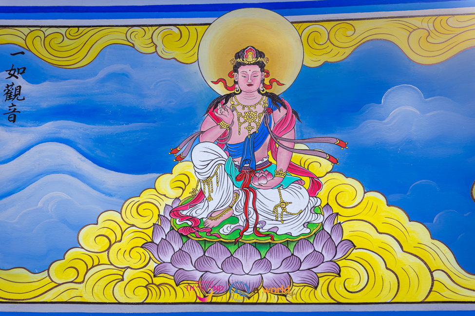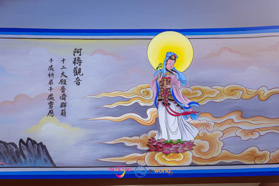 ส่วนภายในโถงวิหารประดับด้วยจิตรกรรมฝาผนังตำนานของพระโพธิสัตว์กวนอิมในแต่ละปาง จำนวน 11 ภาพ จาก 84 ปางที่เป็นที่รู้จัก บนฝ้าเพดานเป็นรูปเขียน มันดาลา สัญลักษณ์แห่งมณฑลศักดิ์สิทธิ์แห่งการตรัสรู้ขององค์พระพุทธเจ้าตามคติธรรมพุทธวัชรยาน